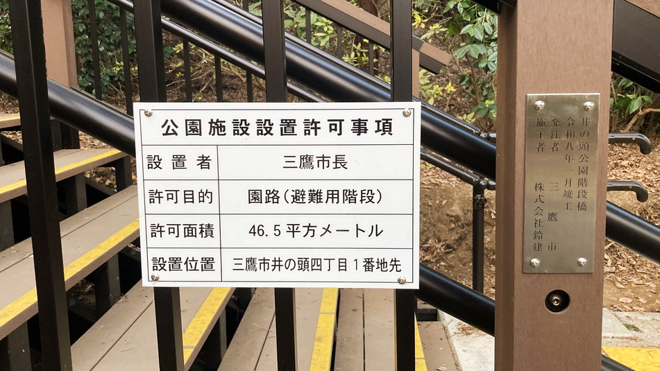 井の頭公園の弁天様の方の直して新しくした階段の表示。分かっていたけど三鷹市。 井の頭公園は武蔵野市と三鷹市をまたいでいるのだけどいわゆるお花見でわいわいするエリアは三鷹市で、階段の手前のいせやまでが武蔵野市らしい。なので実際にお金が落ちるところと、落ちないところで自治体が違うという明暗がある。公園内のサブライムは三鷹市なんだから良いじゃないですか、とかでお茶を濁せませんか?みたいな。